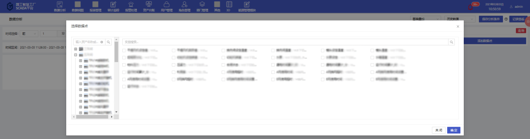 以某一特定設(shè)備為例,使用平臺(tái)數(shù)據(jù)分析功能,將平臺(tái)中的有效數(shù)據(jù)進(jìn)行分析。根據(jù)用戶的需要,對(duì)一段時(shí)間內(nèi)的歷史數(shù)據(jù)或?qū)崟r(shí)數(shù)據(jù)按照一定的統(tǒng)計(jì)頻率進(jìn)行多個(gè)維度的數(shù)據(jù)分析,統(tǒng)計(jì)頻率包含不限、10秒、30秒、5分鐘、10分鐘、30分鐘、1小時(shí),通過(guò)添加變量操作,在彈出的變量選擇彈窗中可多選數(shù)據(jù)點(diǎn)信息,可以通過(guò)資產(chǎn)樹(shù)選中資產(chǎn)來(lái)選擇數(shù)據(jù)信息或者直接通過(guò)模糊搜索查找數(shù)據(jù)點(diǎn)。數(shù)據(jù)分析得到的圖表顯示形式包括折線圖以及表格形式。多個(gè)數(shù)據(jù)點(diǎn)信息圖表的展示形式包括平鋪、疊加、標(biāo)簽顯示以及合并表格顯示,根據(jù)不同的需求選擇對(duì)應(yīng)的展示形式,靈活性高。數(shù)據(jù)分析幫助用戶分析用戶想要分析的內(nèi)容,如數(shù)據(jù)走向、問(wèn)題等,從而幫助用戶解決問(wèn)題。