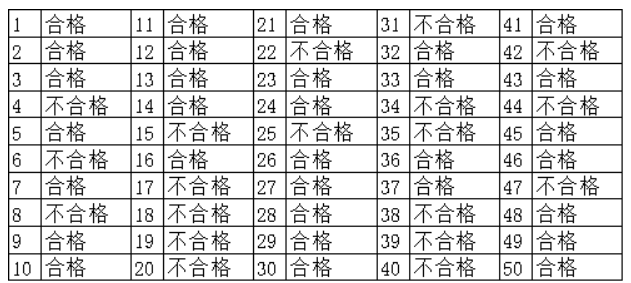 某醫療用品生產企業,對生產的醫用防護手套外觀有一定要求,要求手套寬度符合≥80mm的標準。抽取10只手套,若有8只寬度都小于80mm,那么我們就會認為實際生產寬度小于80mm,不可采用目前設定的參數進行生產。若抽取10只,僅有1只小于80mm,那么我們并不會認為手套的實際寬度均小于80mm。因為,機器制造手套不可能100%保證每次都是完美的,個別小于80mm是正常現象。所以,我們就可以通過單樣本率檢驗來判斷手套的實際生產寬度是否符合外觀標準。該手套生產企業一天能生產1萬只手套,將一天生產的手套作為整體,通過一定的方法抽樣得到50只手套,并對這50只手套的寬度進行檢測,寬度小于80mm的記作不合格(本案例需要每隔一段時間抽樣5只,共抽樣10次來形成樣本,以確保抽樣的涵蓋率),得到50次試驗手套寬度的檢驗結果,如表1所示。