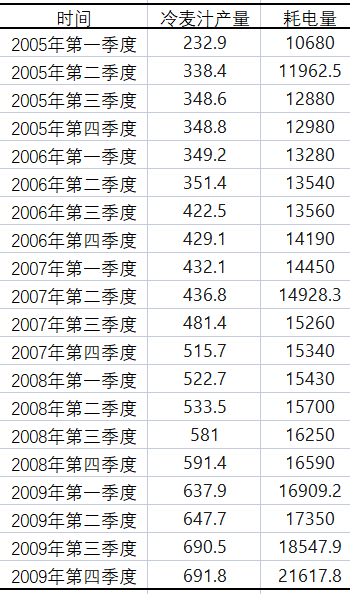 對于啤酒生產企業,控制能源消耗是生產管理的重要部分。制冷耗電量是啤酒生產最大的能源消耗之一,占啤酒企業耗電量的43%左右。怎樣降低能源消耗, 加大成本控制力度是啤酒企業搞好生產管理的首要問題。為此本案例將驗證冷麥汁的產量和制冷耗電量是否存在因果關系。從而為減少能源消耗提供決策方向。