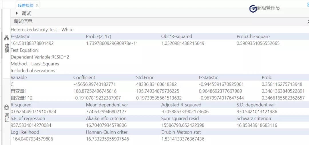 根據圖11可知,懷特檢驗統計量的值為1.052,它也服從自由度為2的卡方分布,在0.1的顯著性水平下,其臨界值=4.605,懷特檢驗統計量值<臨界值,接受原假設,該殘差序列存在方差相等的情況。