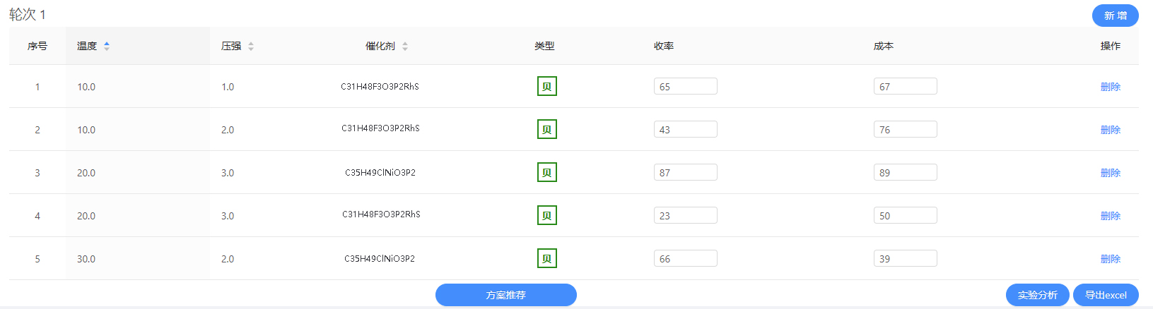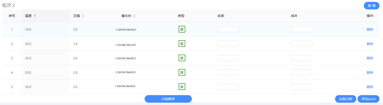 其次,實驗信息配置完成后,即可開始進行算法優化。在首輪沒有歷史數據的情況下,需要隨機從搜索空間中生成用戶指定個數的初始樣本,這里以5個為例,如圖3為輪次1的信息,這里的收率及成本實際值需要做實驗進行回填,用戶也可以根據自己的需求刪除一些樣本。