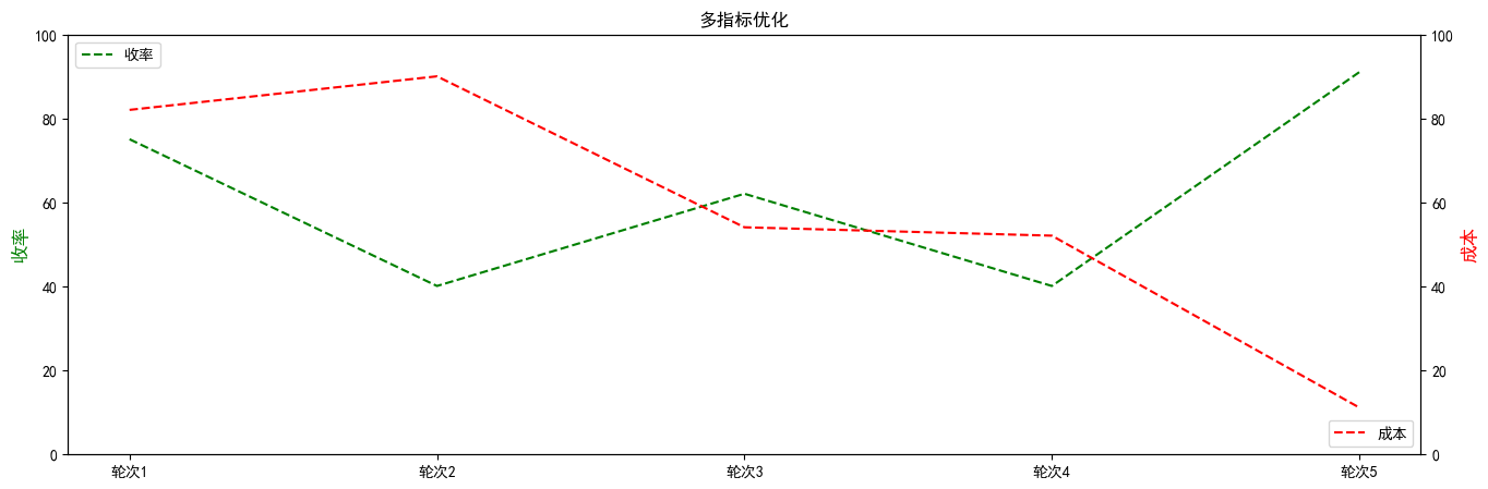 下圖為本示例最終推薦效果的可視化展示,取出每輪推薦方案中指標值較優的點繪制折線圖,雖有所波動,但收率整體上朝著最大化的方向進行優化,同時成本也在逐漸最小化,并在第5輪推薦方案中二者均達到了可以接受的水平,證實了該算法的有效性。