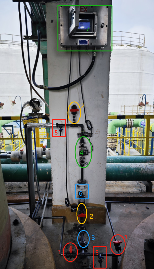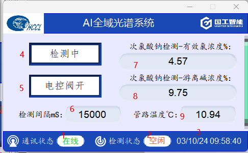 圖中圈1的地方為手動閥,當打開其中一個手動閥,物料即流經管道,接著打開電磁閥(圈2)物料先經過Y型過濾器(圈3),再經過視盅(圈6),然后充滿光譜儀(圈4)一直流經至取樣口(圈5),打開取樣口進行取樣送檢,同時光譜儀開始檢測,當實驗室檢測結果出來后,我們將同批次光譜檢測的物料有效氯的含量參數(shù)和游離堿的含量參數(shù)進行標定,以此類推,進行大量取樣檢測標定過程。檢測結果在光譜控制柜(圈7)上直接顯示。