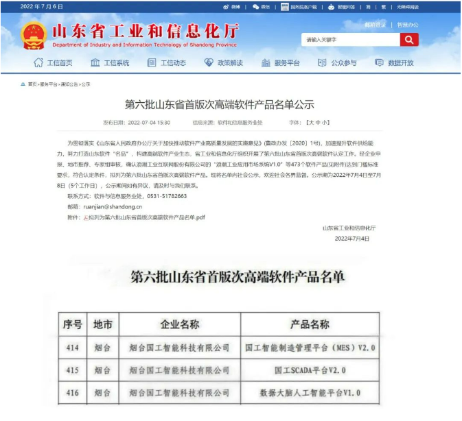 74日,山東省工信廳公示了第批山東省首版次高端軟件產品名單,煙臺國工智能科技有限公司自主研發的數據大腦人工智能平臺V1.0”、國工智能制造管理平臺(MES)V2.0”、“國工SCADA平臺V2.0款軟件產品同時成功入選,煙臺市獲批數量最多專業軟件企業。