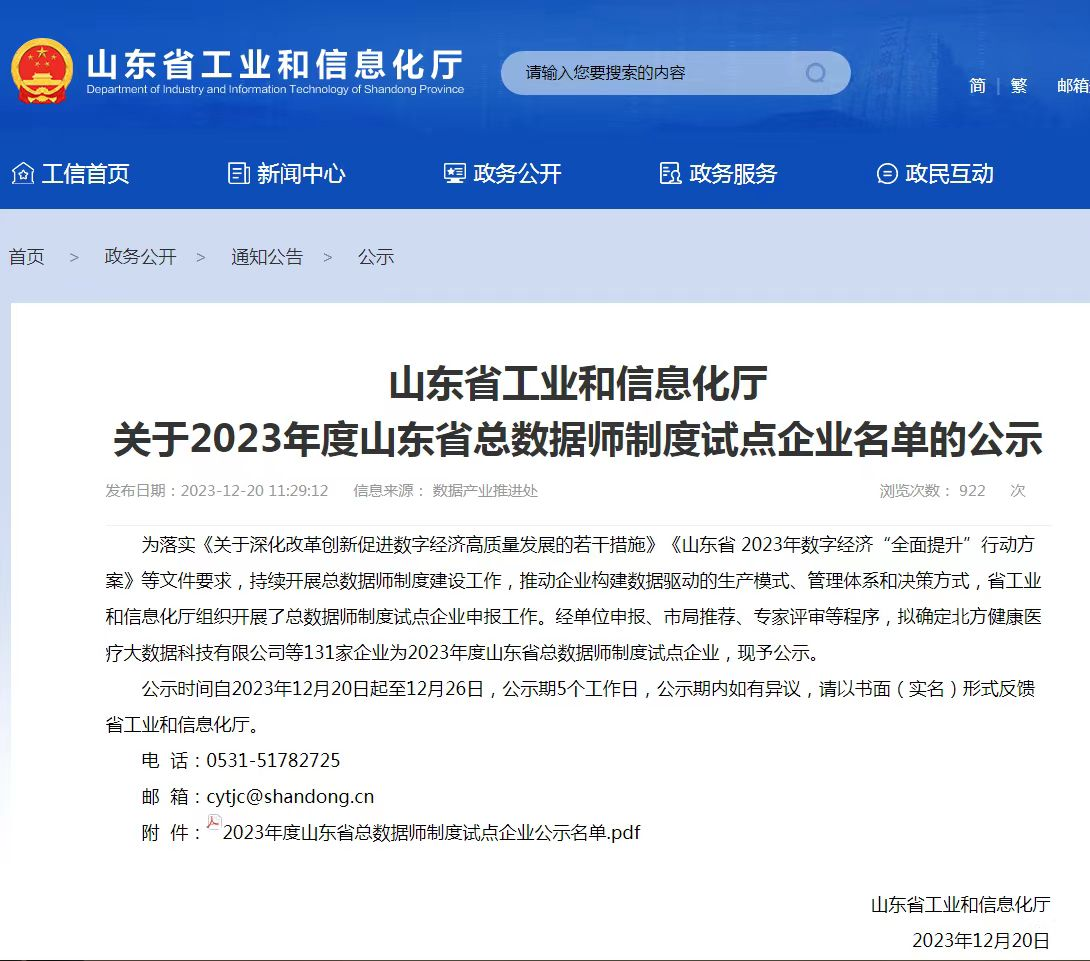 2023年12月20日,省工信廳公示了2023年度山東省總數據師制度試點企業入選名單,煙臺國工智能科技有限公司“榜上有名”。